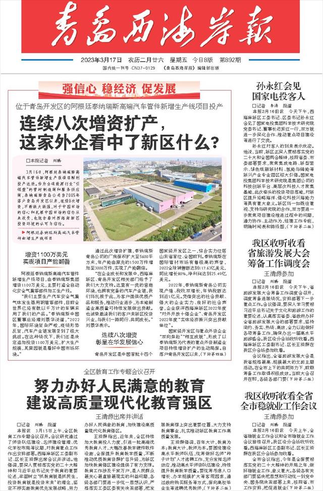 国家级开发区与重点外资企业“双向奔赴”“相互成就”,形成了以泰纳瑞斯为代表的重点外资制造业项目持续增资扩产的生动局面。自落户青岛开发区以来,泰纳瑞斯青岛公司连续8次增资,目前注册资本金已增至1亿美元。