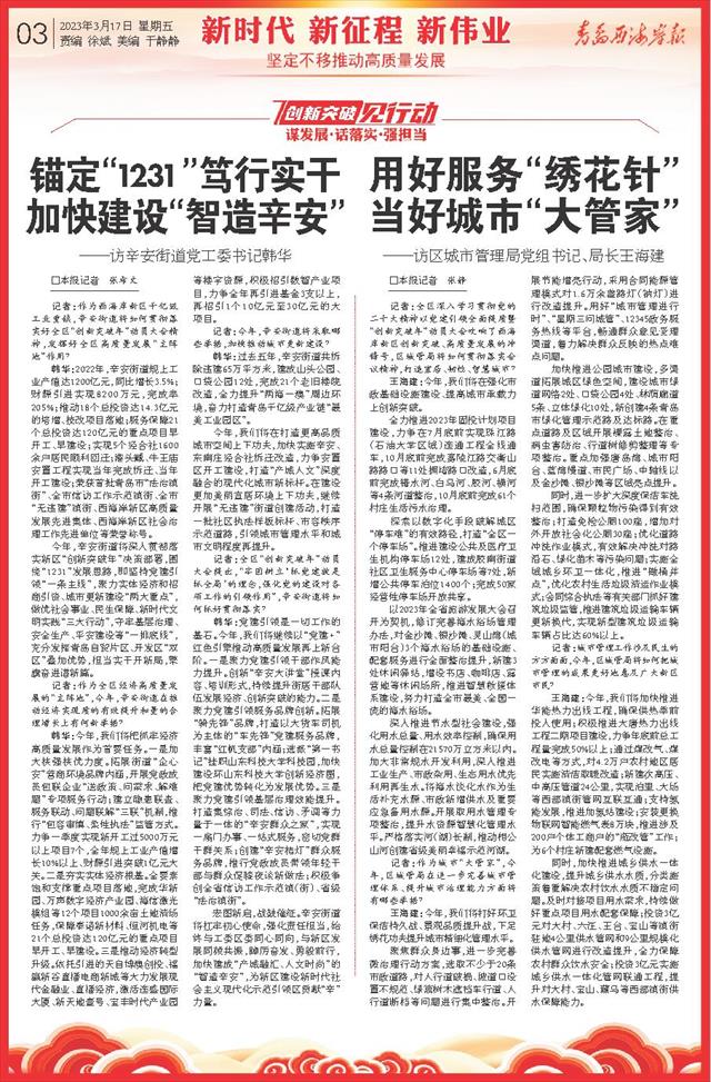 锚定“1231”笃行实干 加快建设“智造辛安” ——访辛安街道党工委书记韩华   □本报记者 张希文
