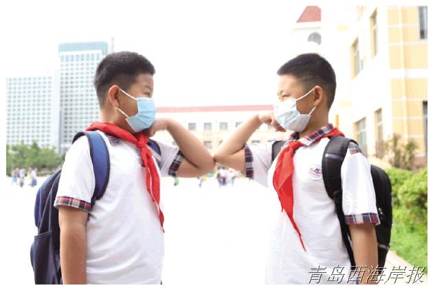 6月2日,西海岸新区第二实验小学二年级的两位学生相互“碰肘”打招呼。 □记者 王培珂 报道