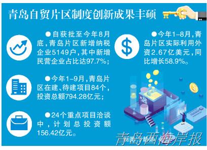制度创新带来的红利已经开始释放。统计数据显示,从去年获批至今年8月底,青岛自贸片区新增纳税企业5149户,其中新增民营企业占比达97.7%,成为带动片区经济的主导力量;今年1-8月,青岛片区实际利用外资2.67亿美元,同比增长58.9%。今年1-9月,青岛片区在建、待建项目84个,投资总额794.28亿元;重点在谈项目24个,计划总投资额156.42亿元。