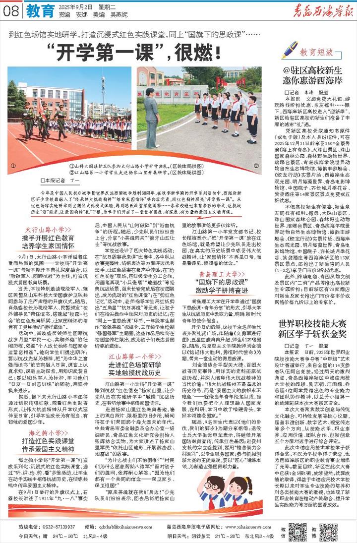 今年是中国人民抗日战争暨世界反法西斯战争胜利80周年,在秋季新学期的开学系列活动中,西海岸新区不少学校都融入了“传承伟大抗战精神”“培育家国情怀”等内容元素,用红色精神照亮“开学第一课”。从红色场馆实地研学到主题仪式沉浸式体验,再到思政课堂深度阐释……各学校通过丰富多彩的形式,让抗战历史“活”起来,让爱国精神“扎”下根,为学子们开启了一堂堂有温度、有深度、有力量的爱国主义教育课。
