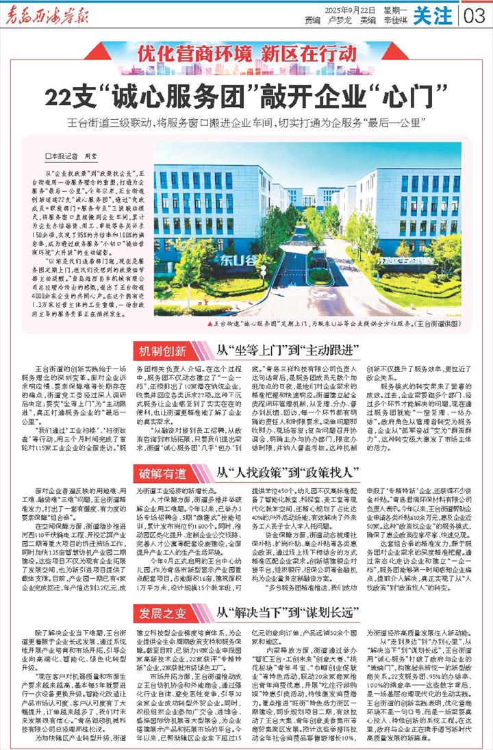 “以前是我们追着部门跑,现在是服务团定期上门,连我们没想到的政策细节都主动提醒。”青岛海西岳丰机械有限公司总经理冷传山的感慨,道出了王台街道4000余家企业的共同心声。在这个拥有近1.3万家经营主体的工业重镇,一场由政府主导的服务变革正在悄然发生。