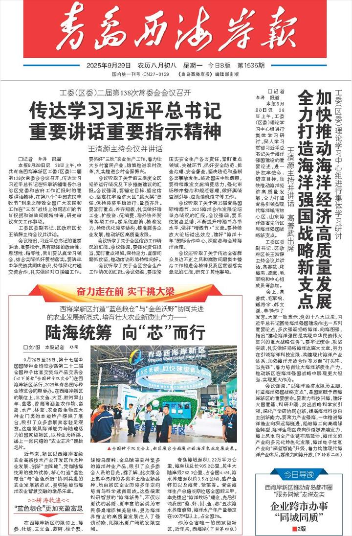 本报9月28日讯 28日上午,中共青岛西海岸新区工委(区委)二届第138次常委会会议召开,传达学习习近平总书记在听取新疆维吾尔自治区党委和政府工作汇报时的重要讲话精神,在第八个“中国农民丰收节”到来之际致全国广大农民和工作在“三农”战线上的同志们的节日祝贺和诚挚问候精神等,研究审议有关工作事项。