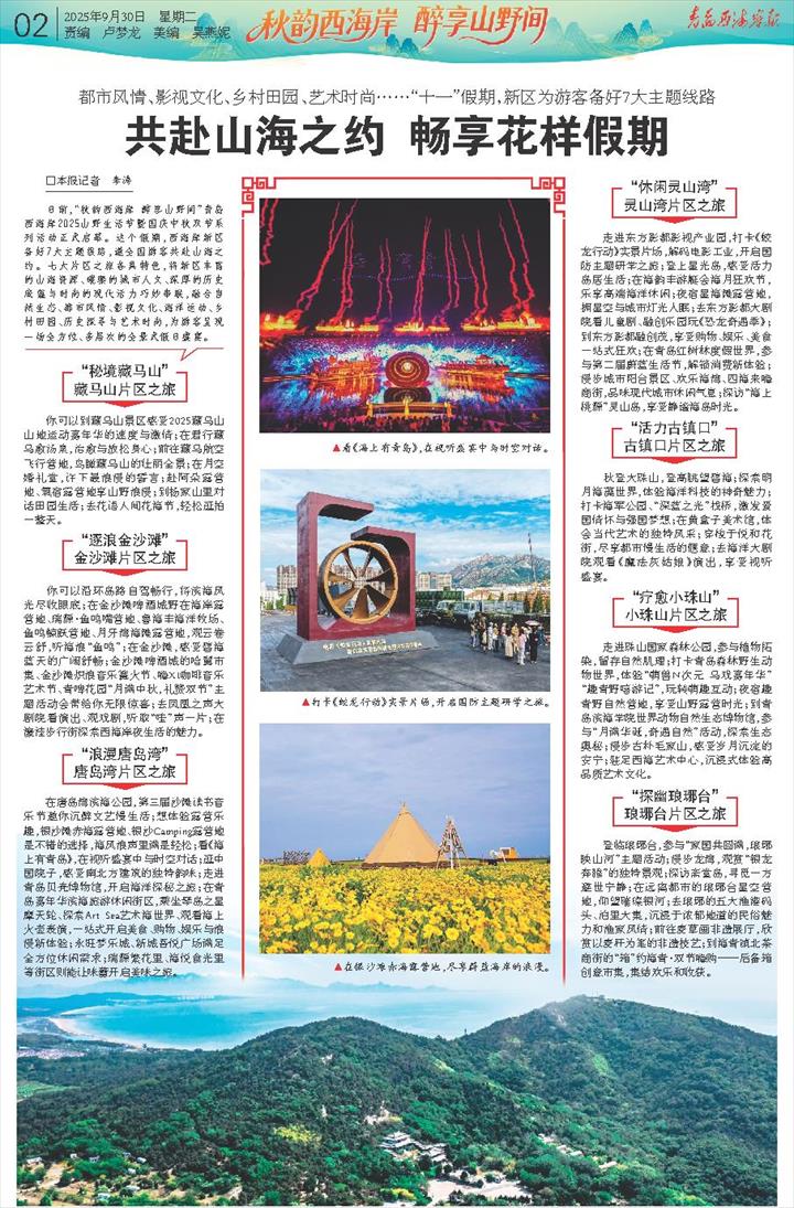 日前,“秋韵西海岸 醉享山野间”青岛西海岸2025山野生活节暨国庆中秋双节系列活动正式启幕。这个假期,西海岸新区备好7大主题线路,邀全国游客共赴山海之约。七大片区之旅各具特色,将新区丰富的山海资源、璀璨的城市人文、深厚的历史底蕴与时尚的现代活力巧妙串联,融合自然生态、都市风情、影视文化、海洋运动、乡村田园、历史探寻与艺术时尚,为游客呈现一场全方位、多层次的全景式假日盛宴。