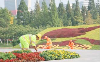 ▲工作人员对公园广场的花卉布景进行修整。(公用集团供图)