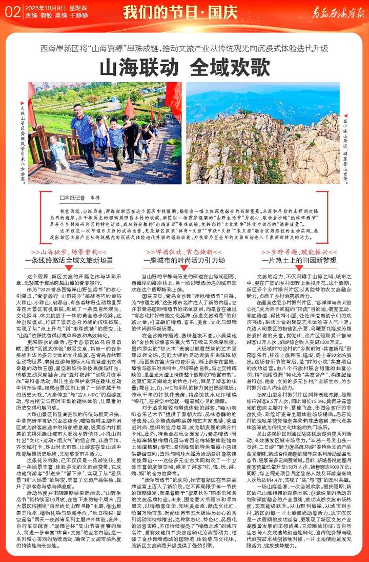 秋色为笔,山海为卷,西海岸新区在这个国庆中秋假期,描绘出一幅文旅深度融合的崭新图景。从层林尽染的山野到欢腾热烈的海岸,从千年历史的回响到田园乡村的欢笑,新区以一场贯穿假期的“山野生活节”为核心,联动金沙滩“迷你啤酒节”及多个乡村振兴片区的特色活动,成功将分散的“山海资源”串珠成链,把静态的“文化故事”转化为动态的“消费流量”。