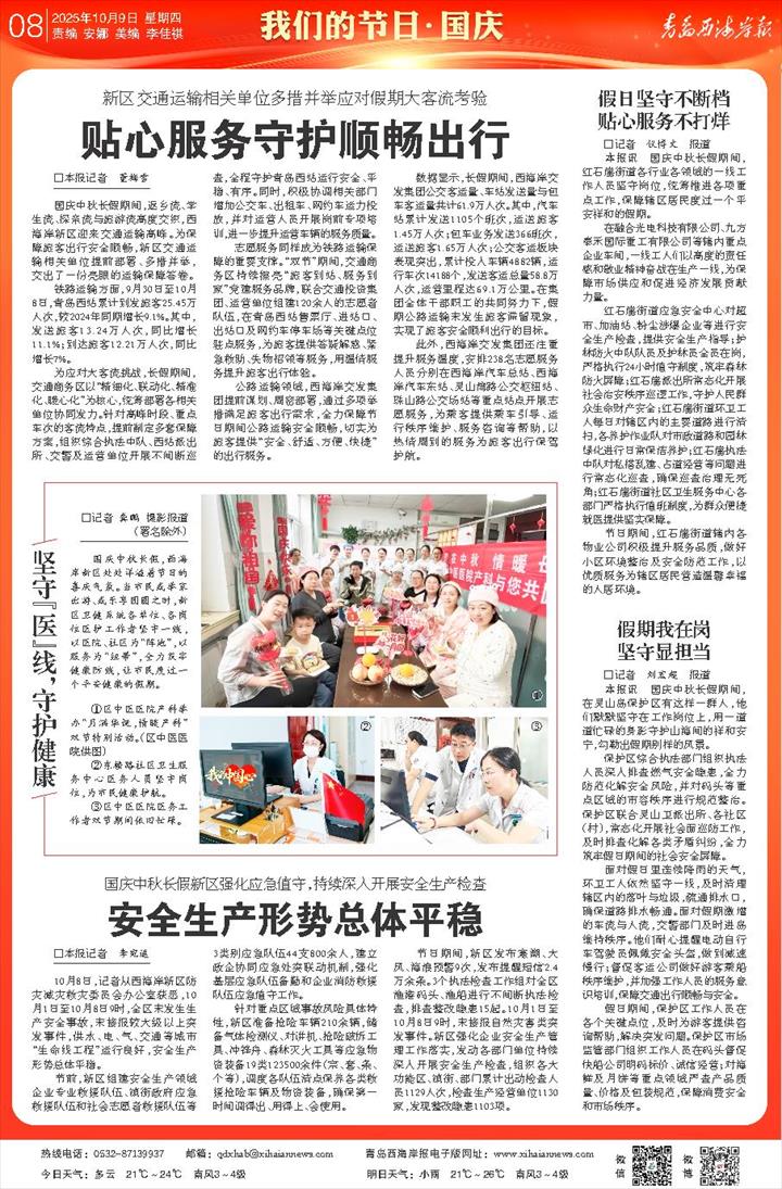 10月8日,记者从西海岸新区防灾减灾救灾委员会办公室获悉,10月1日至10月8日9时,全区未发生生产安全事故,未接报较大级以上突发事件,供水、电、气、交通等城市“生命线工程”运行良好,安全生产形势总体平稳。