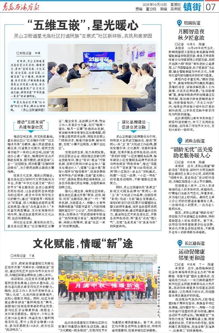 近年来,灵山卫街道星光岛社区立足实际、精准发力,紧扣“空间互嵌、文化互嵌、社会互嵌、经济互嵌、心理互嵌”五个维度,创新举措、务求实效,不断拓展各族居民全方位嵌入路径,有力促进各族居民广泛交往交流交融,持续织密“中华民族一家亲”的幸福网络。