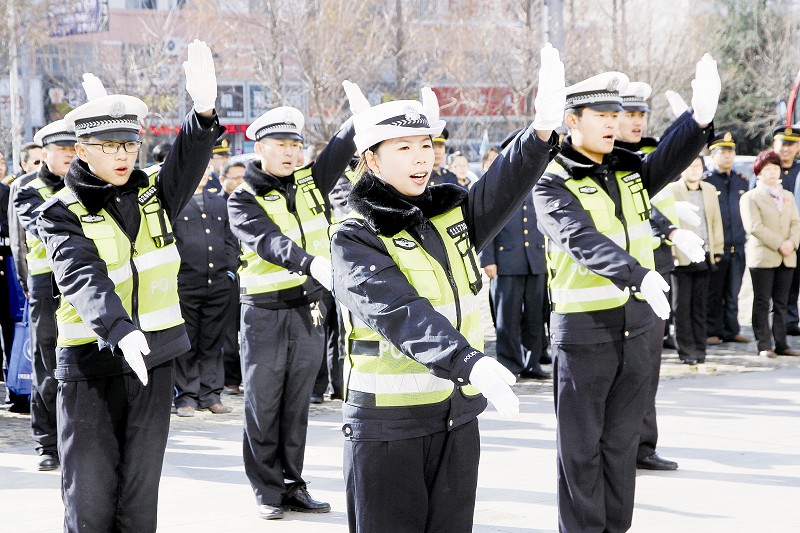 12月2日是第三个全国交通安全日,青岛市公安局黄岛分局交警大队开展了集中宣传活动。按照2014年“全国交通安全日”主题活动统一部署,全国公安交管部门在12月2日开展统一行动,集中查处超速、超载、酒驾、毒驾、占用应急车道、不礼让斑马线等七类突出违法行为。图为交通民警正在对市民进行手势演示。(王培珂)